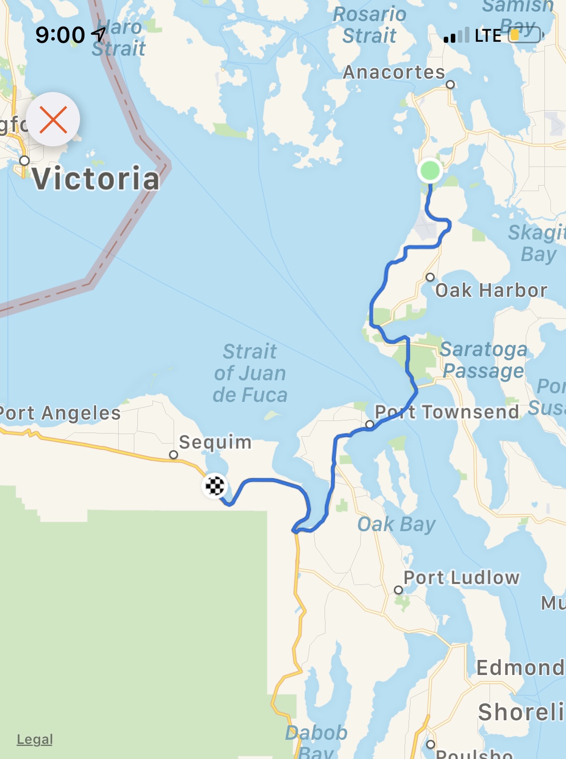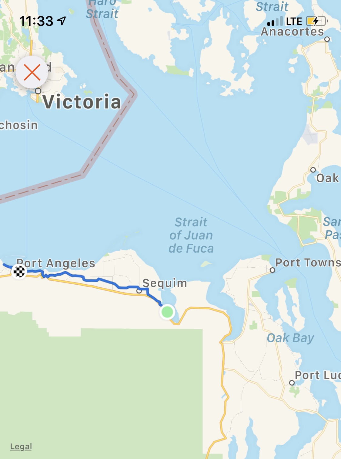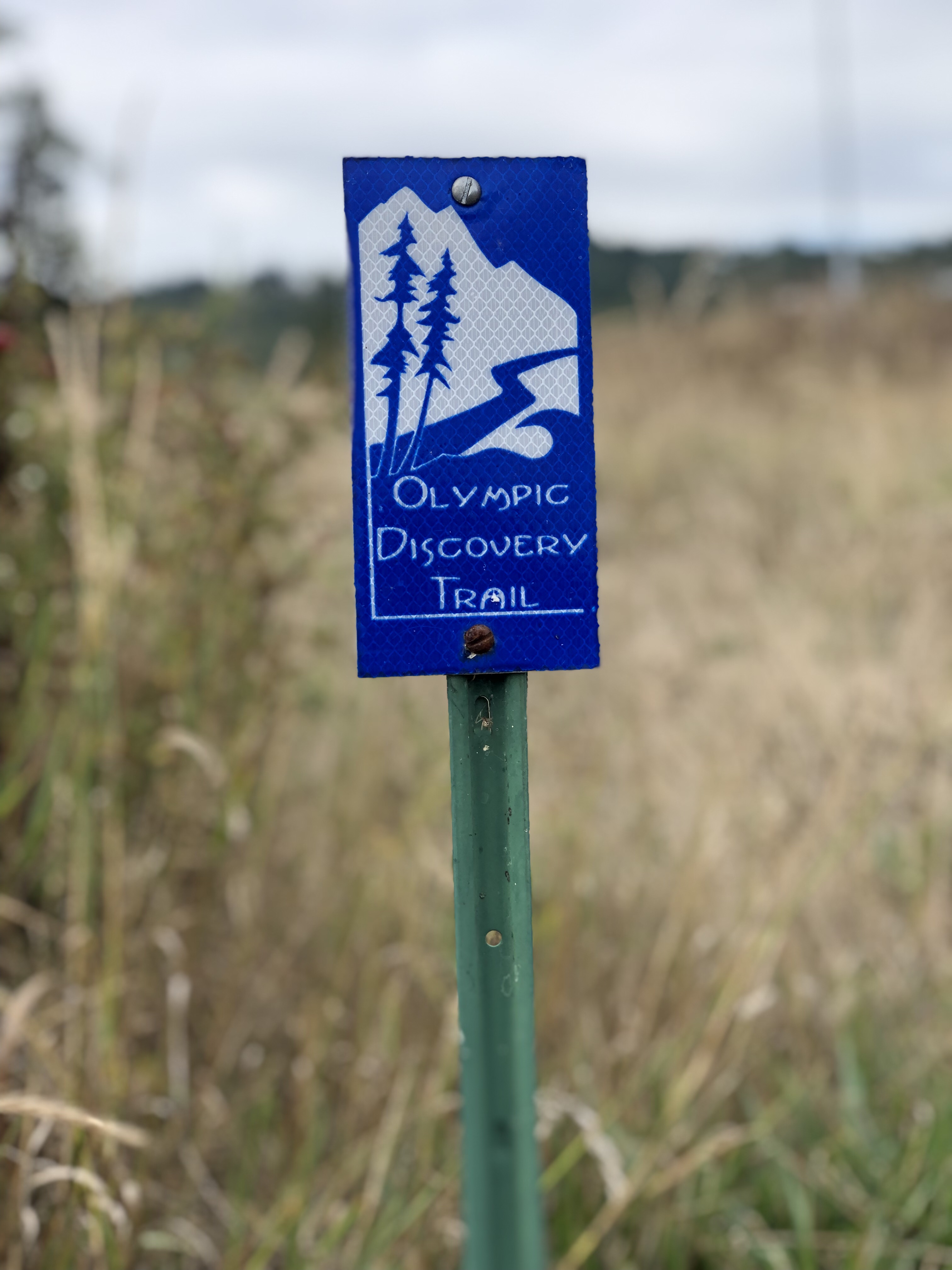 As I woke up today, I felt a bit stiff after having ridden 200+ miles over the last three days… all while carrying my heavy load! I made breakfast consisting of an apple I picked up at the orchard yesterday, granola with blueberries, hot coffee and two ibuprofen! It wasn’t so much the legs muscles bothering me, but rather my hips and knees were aching. Nothing terrible… just some light joint discomfort. After brushing my teeth and saying goodbye to Ann and her little dog Ruby, I rolled out of beautiful Sequim Bay State Park 10:30 AM. As I was headed out of the campground, I noticed a little path running the same direction as I would have been going on the highway 20. After looking at the map followed by a quick Google search (thank goodness for technology and decent cell service), I learned this path was the “ODT” (Olympic Discovery Trail) which apparently is rather famous and popular and essentially goes around most of the perimeter of Olympic Peninsula. But more importantly I learned it was a fairly direct route to Port Angeles which would get me off the busy Highway 20 for a while.