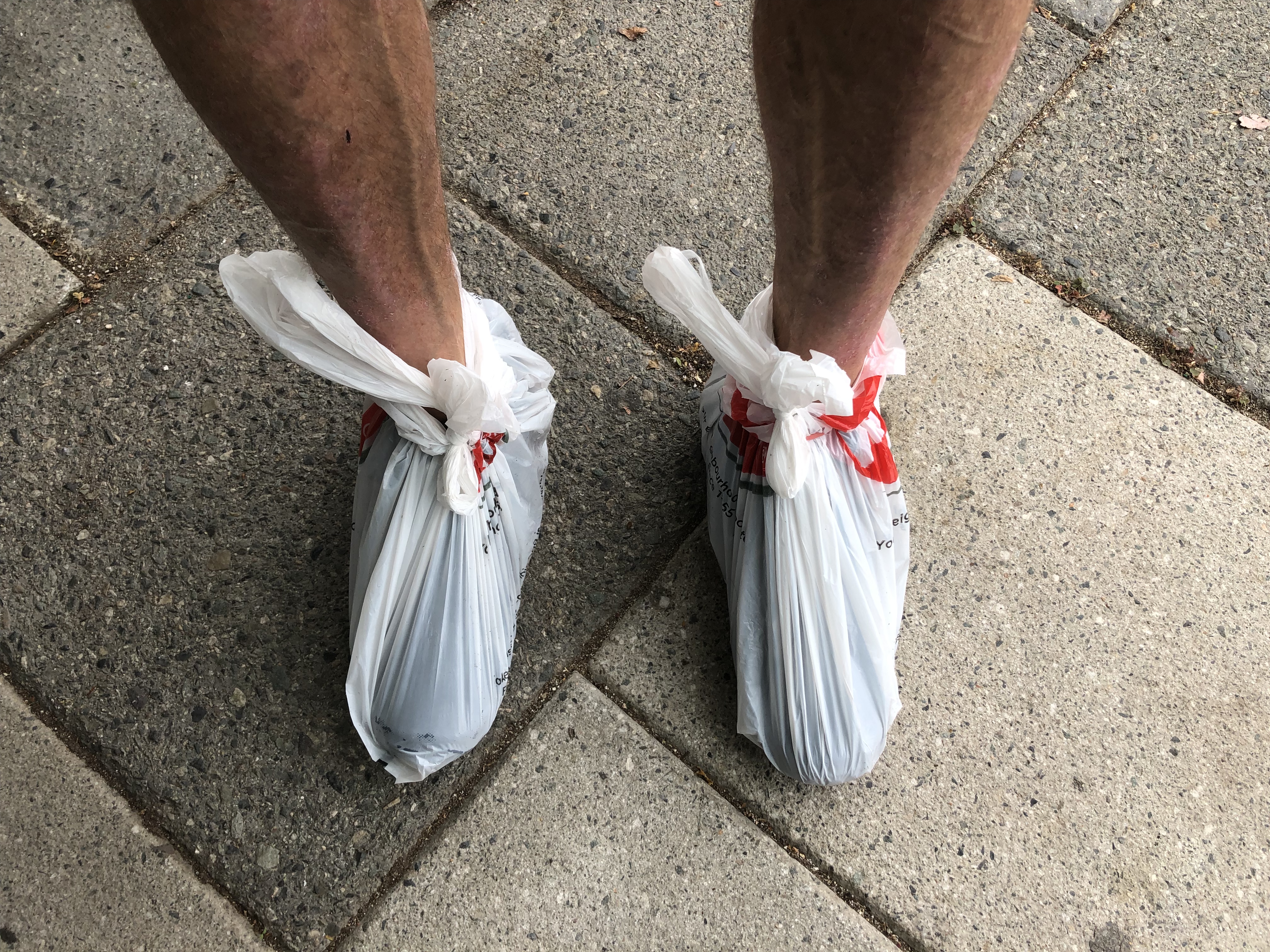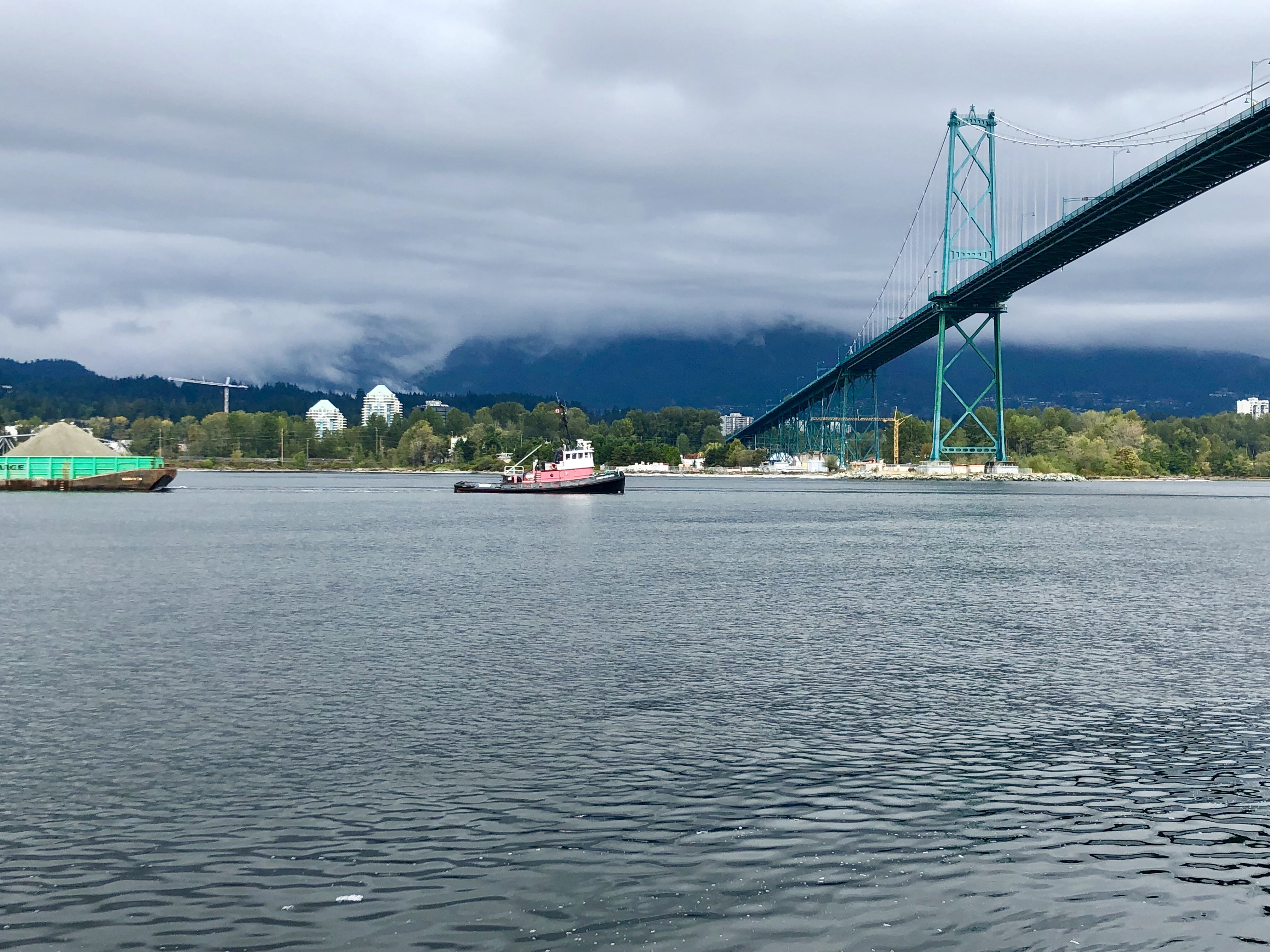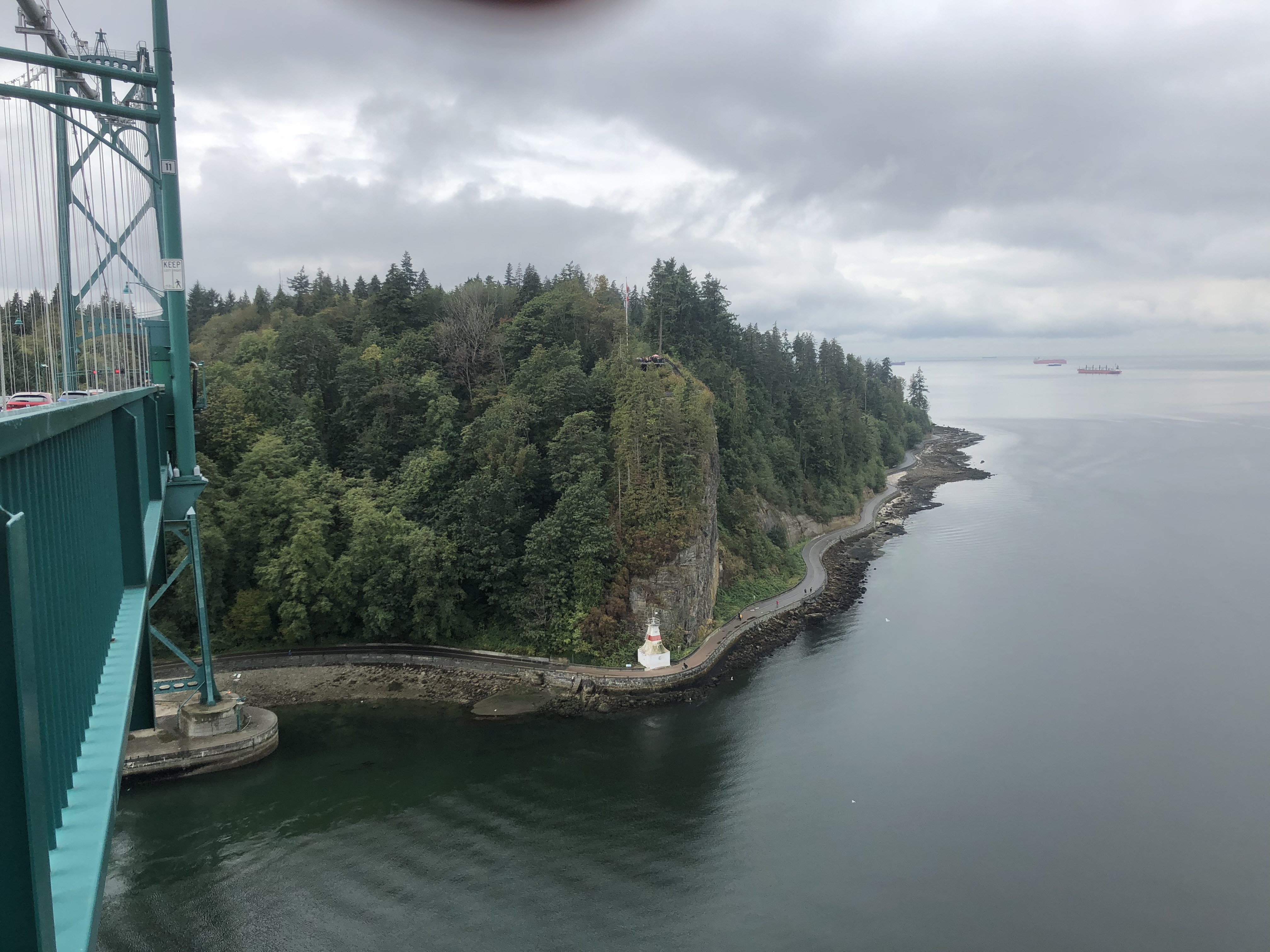 After breakfast I quickly set to work organizing and re-packing my bags and departed their house at 8:45 AM. My first order of business was retracing my steps back along Marine Drive which follows a scenic seaside road back to Lions Gate Bridge that is the access point back to downtown Vancouver. Marine Drive is very hilly and the distance is about 12 miles from their house. I was finally officially starting my ride… woohoo! Before reaching the bridge, it started drizzling and I stopped to get out my new Patagonia rain jacket and helmet cover. A mile down the road I ran into a local grocery store and got a couple of plastic bags that I used to wrap around my feet to keep my shoes dry. I reinforced this with a couple of rubber bands around my ankles where the bag was tied off. I certainly got a few funny looks, but this was definitely more about function than fashion… and function it was as they work beautifully to keep my feet and shoes warm, dry and cozy! At the apex of the bridge, I stopped to look at the expensive views in every direction and looked at Stanley Park (which I had ridden around countless times over the years) from this cool new perspective and vantage pointe that I hadn’t seen before. Once I crossed into Vancouver my next plan of action was to find an outdoor retailer to buy some white gas for my stove. Airliners don’t like the transportation of combustible liquids in small containers and so I had to leave my liquid gas at home. With a 2 to 3 mile detour, I eventually found this really cool co-op by the name of MEC which is very similar in design and feel of REI. As I was checking out, I asked the clerk where the nearest and best Ramen noodle shop was and he suggested two options just a few blocks away. I figured I should get some authentic Japanese Ramen noodle soup as a great meal before I headed out of the city. And boy was he right! I slurped down the most amazing Ramen in about 30 minutes while periodically careening my neck to see if my bike was still locked to the tree outside the front door.