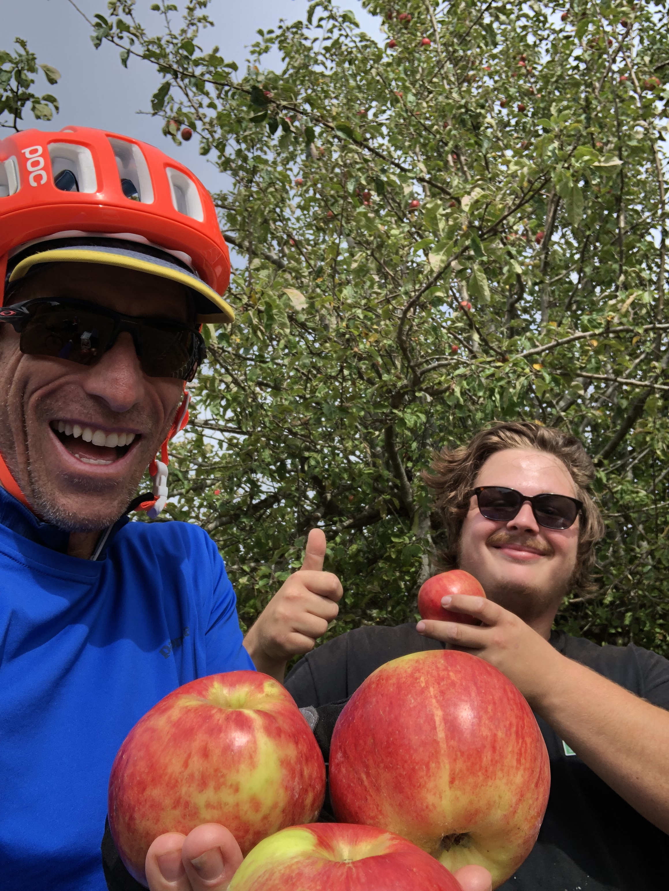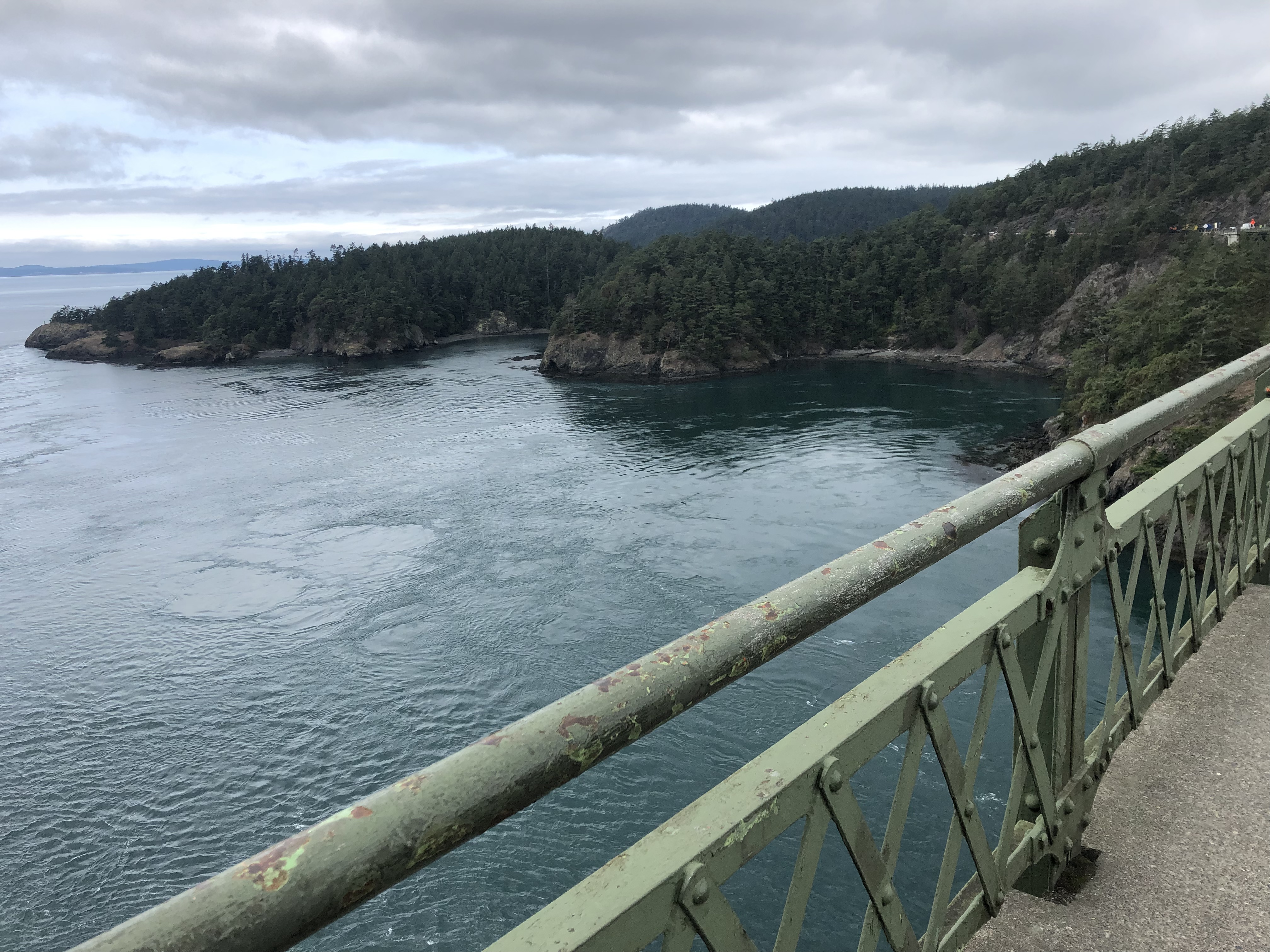 I ended up hanging out in Rosario beach most of the morning including going for a bit of a hike on a beautiful path that climbs up to great vantage point overlooking the coastline and secluded bay. The process of packing up all the camping gear and all the other things, while making sure everything goes back in its exact same place, takes a little more time than I expected… averaging between an 1 and 1.5 hours. I finally said all my goodbyes and rolled out of beautiful Rosario Bay State Park Campground around 11:30 AM. I only road about 2 miles before stopping for some more food at a local country store. I was really in the mood for a breakfast burrito or breakfast sandwich of some sort, but since it was close to noon and they were long sold out, I settled for a 1 pound apple fritter with which probably had 100 grams of sugar! With the last bite still in my mouth, I continued riding and went across some really cool bridges climbing and descending in the never ending cycle. At some point just before reaching the quaint little seaside town of Coupeville, I noticed some people picking apples in a small orchard consisting of three apple trees off the side of the road. The ever opportunist in me decided to I stop and so I pulled around to where they were and asked if they had any apples to spare which, with great enthusiasm, said I can take as many as I would like. It seemed as if it were a family and they said they were picking apples on their own property to make a big batch of cider for themselves and their friends. This young man got down off this rickety ladder and said he would move to over to get some better and bigger apples for me which he did, dropping them down to me one by one. I really only had enough room for three, so I thanked them for their kindness and went on my way, but not before taking a picture with my apple picking friend.😊
